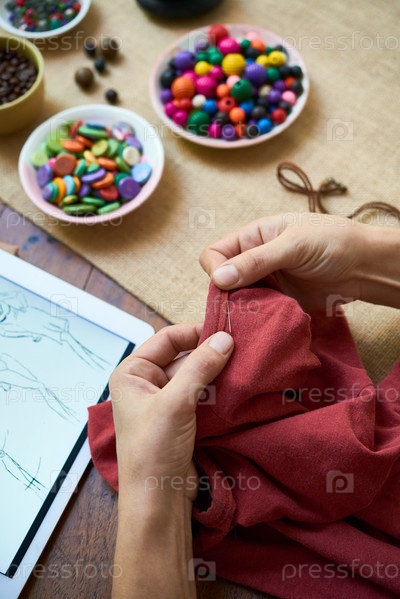 Женщина шьет одежду