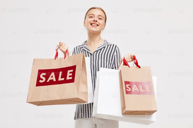 Веселая красивая девушка в стильной блузке стоит на белой стене и держит кучу сумки с покупками, получая удовольствие от распродажи