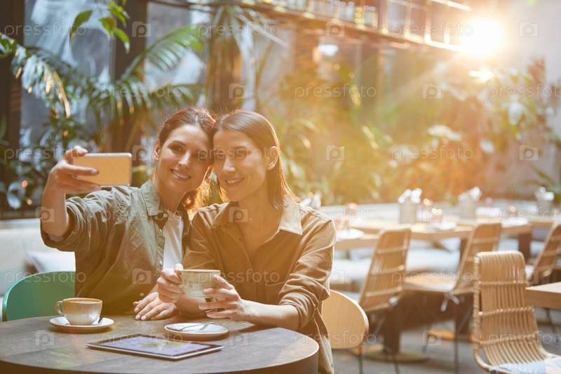 Две современные женщины делают селфи на столе в кафе