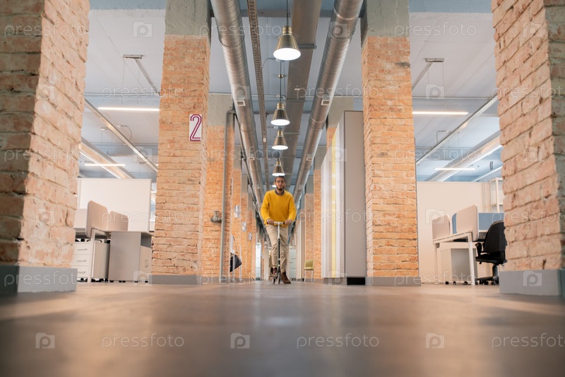 Беспокойный сотрудник ездит на скутере в офисе