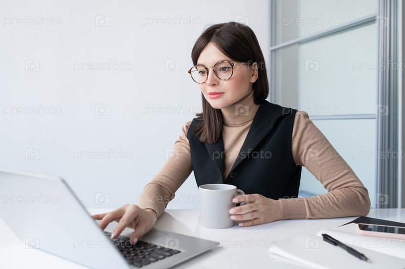 Молодая современная бизнесвумен с напитком анализирует финансовые данные онлайн