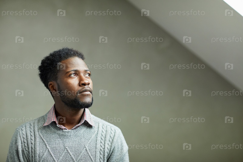 Серьезный, задумчивый молодой чернокожий мужчина с бородой стоял в пустой комнате и смотрел на свет