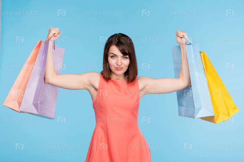 Молодая брюнетка-покупательница поднимает бумажные пакеты после успешного шопинга