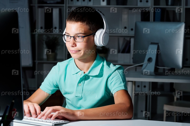 Умный серьезный школьник в наушниках, смотрящий на компьютерный экран во тьме