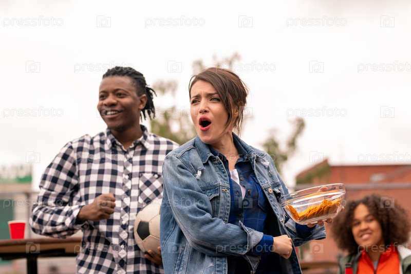 Молодые взволнованные друзья или свидания со закуской, приветствующие свою футбольную команду