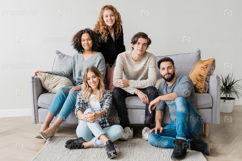 Молодые веселые дружелюбные парни и девушки в повседневной одежде, наслаждающиеся досугом дома