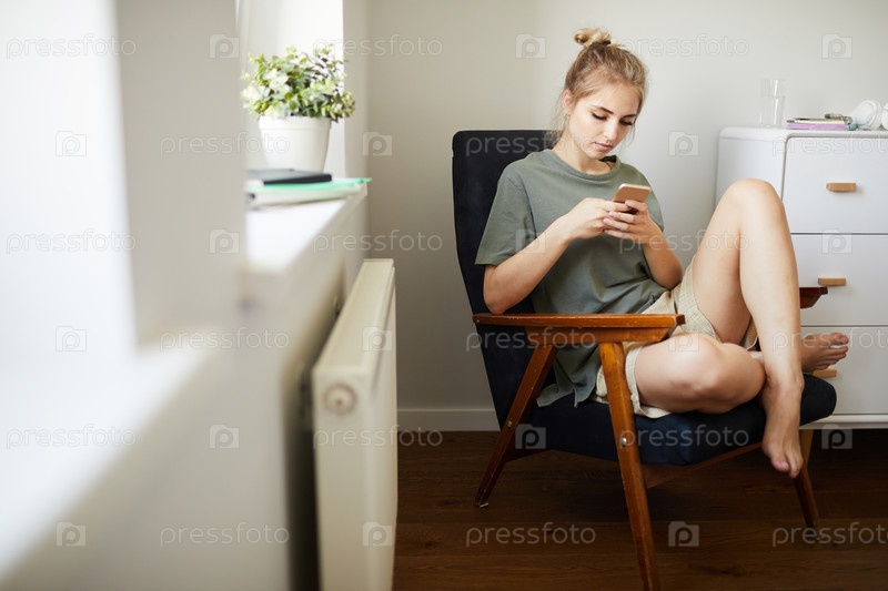 Милая девушка в повседневной одежде смотрит видео на смартфоне