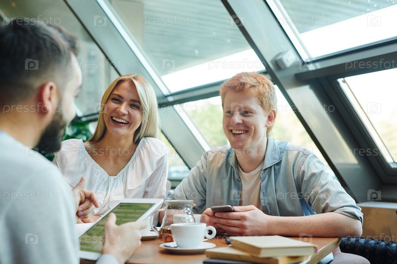 Молодая смеющаяся пара слушает своего друга из колледжа во время обсуждения новостей