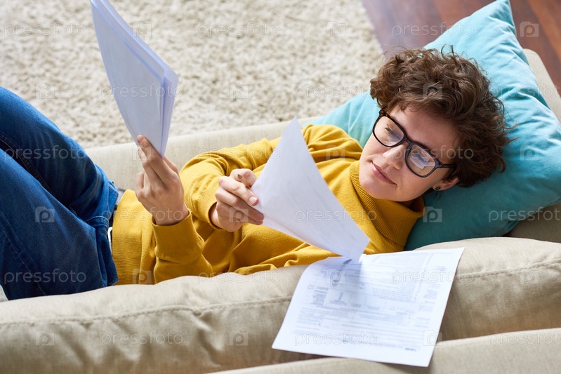 Красивая женщина, лежащая на диване и анализирующая бумаги