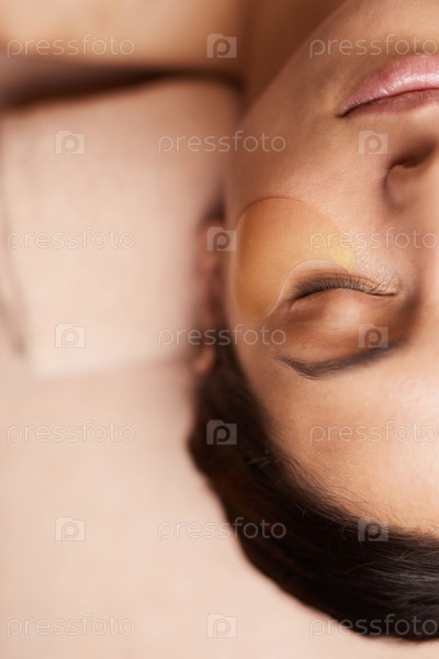Близкий план спокойной молодой женщины с гидрогелевыми глазными пластырями, которые держат глаза закрытыми во время процедуры по уходу за кожей