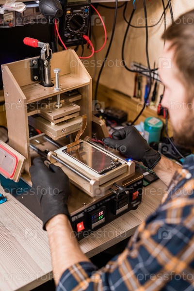 Профессиональный ремонтник в защитных перчатках с использованием оборудования для ремонта гаджетов