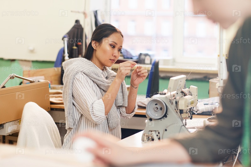 Женщина шьет иглой
