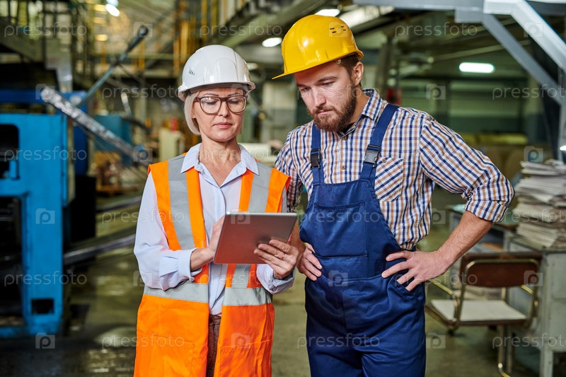 Уверенная умная женщина-инженер в рабочем шлеме показывает коллеге онлайн макет на планшете, когда они работают на фабрике