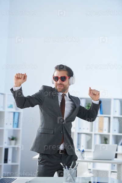 Счастливый мужчина в формальной одежде, солнцезащитных очках и наушниках танцует на рабочем месте