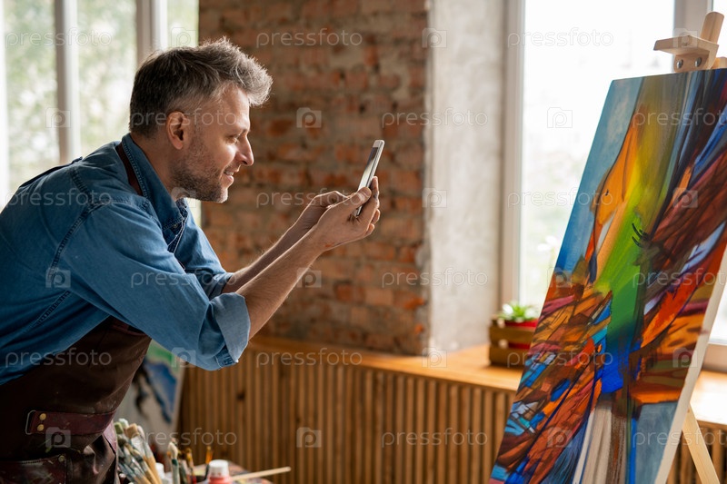 Боковой вид счастливого художника средних лет со смартфоном, фотографирующего произведения искусства