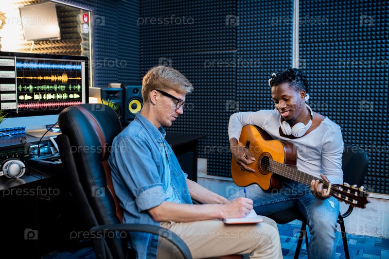 Два молодых мультикультурных мужчины работают над новой песней в звукозаписывающей студии