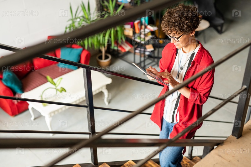Молодая дизайнерка моды в умных повседневных одеждах с использованием цифрового планшета