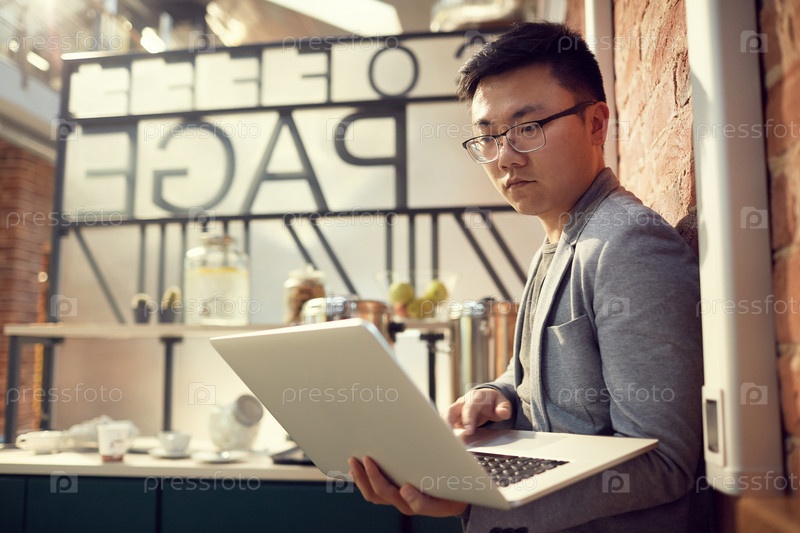 Предприниматель Удерживающий ноутбук Азиатский