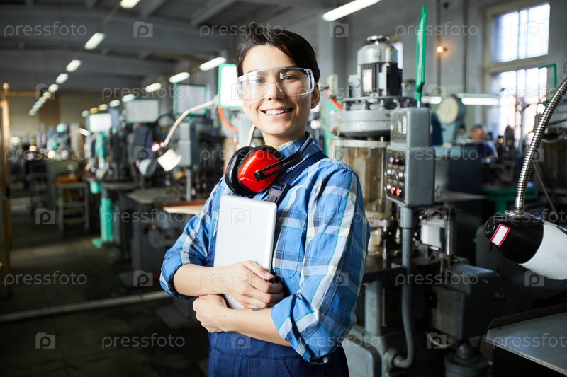 Веселая уверенная в себе мужская женщина-работница часовой фабрики, носящая защитные устройства для ушей на шее и очки безопасности, стоит против автоматических машин и обнимает планшет