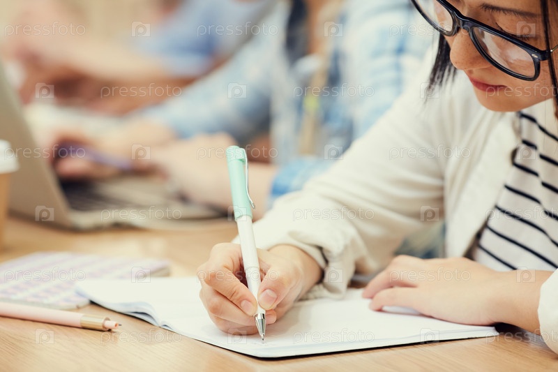 Близкий план серьезной сфокусированной азиатской студентки в очках, сидящей за столом и записывающей лекцию на университетском классе