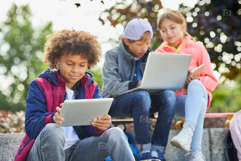Африканский мальчик с планшетным компьютером на открытом воздухе