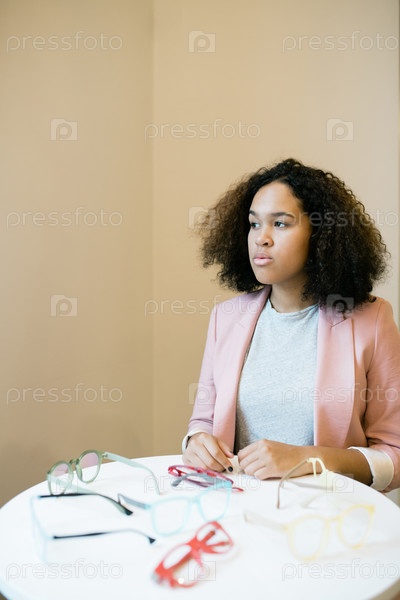 Молодая межкультурная женщина с кудрявыми волосами выбирает новые очки