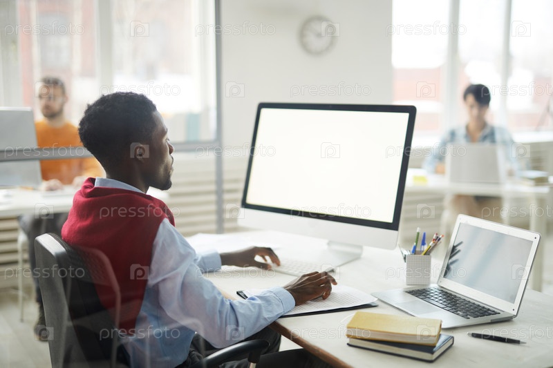 Афроамериканец использует компьютер в офисе