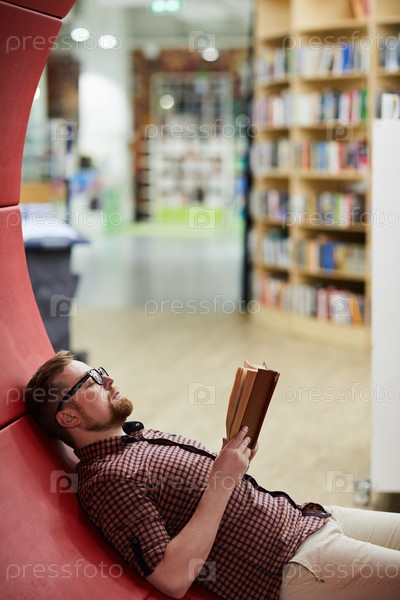 Бородатый человек читает книгу в библиотеке
