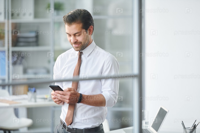 Бизнесмен прокручивает мобильные контакты в смартфоне