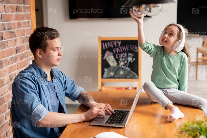 Загруженный отец, работающий дома