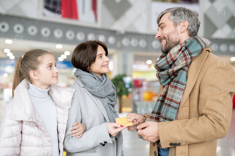 Счастливый мужчина дает кредитную карту жене и дочери перед покупками в торговом центре