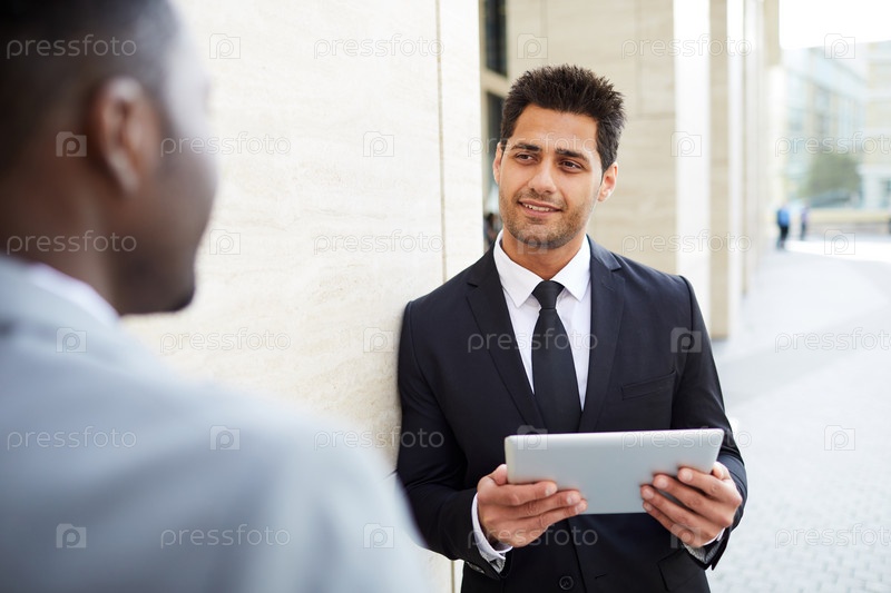 Бизнесмен, использующий цифровые планшеты на открытом воздухе
