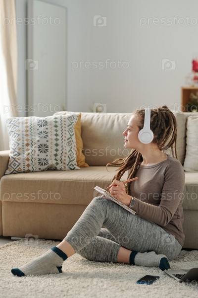 Женщина с наушниками получает вдохновение и записывает новые идеи в блокноте