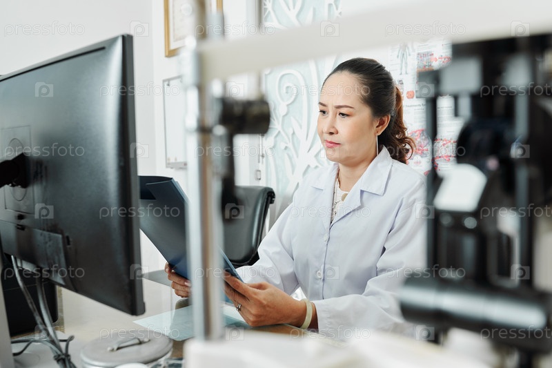 Женщина-врач читает медицинскую карточку