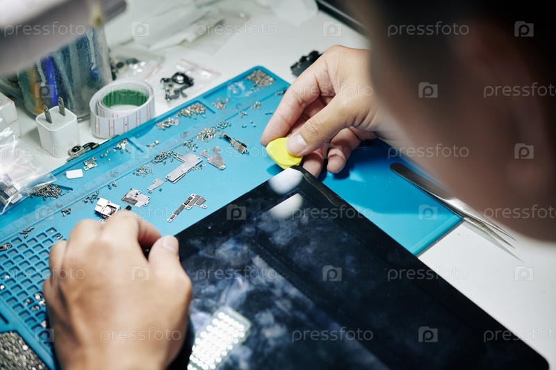 Ремонтник удаляет экран планшета