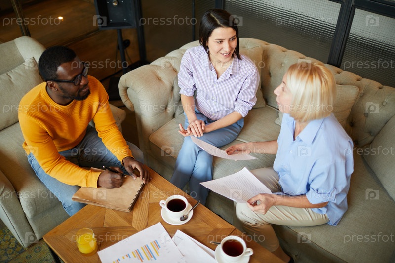 Прямо над нами вид уверенного зрелого финансового консультанта с светлыми волосами, сидящего на диване и рассматривающего документы, давая советы клиентам о том, как управлять бюджетом во время встречи в кафе