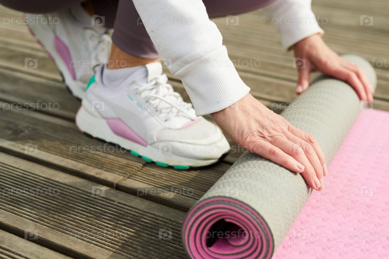 Спортивная женщина разворачивает коврик