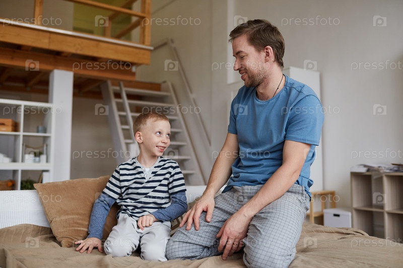 Счастливый молодой одинокий отец в пижаме, сидящий на кровати и разговаривающий с маленьким сыном дома