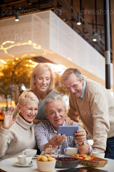 Группа позитивных бывших одноклассников старших классов, общающихся с друзьями через телефонное приложение, собираясь в современном кафе