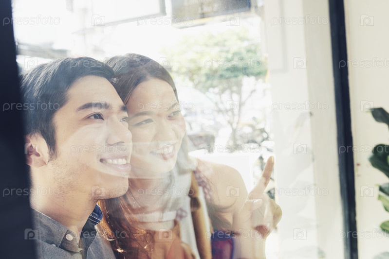 Позитивная пара смотрит на витрину магазина