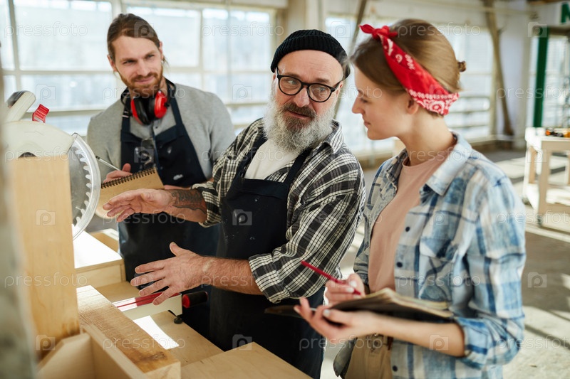 Уверенный в себе профессиональный зрелый плотник в очках и шляпе с шапочкой жестикулирует руками, представляя режущую машину с круговой пилой, он учит обучающихся использовать круговую пилу