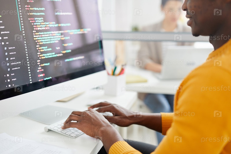 Близкий снимок контента афроамериканский мужчина, сидящий за столом и печатающий на компьютере во время кодирования информации для веб-сайта