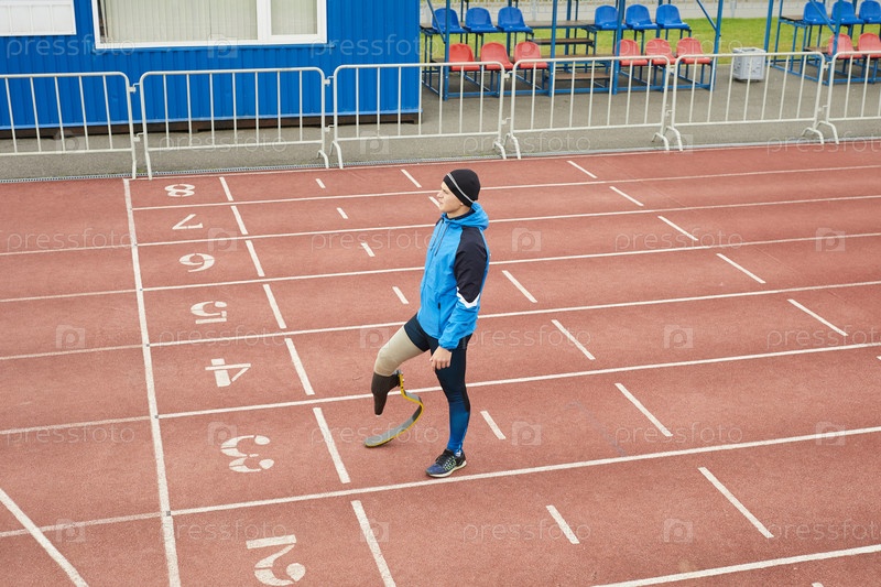 Серьезный интроспективный молодой спортсмен-ампутированный с бегущим лезвием, стоящий на стартовой линии и смотрящий вдаль во время мечты о спортивных соревнованиях