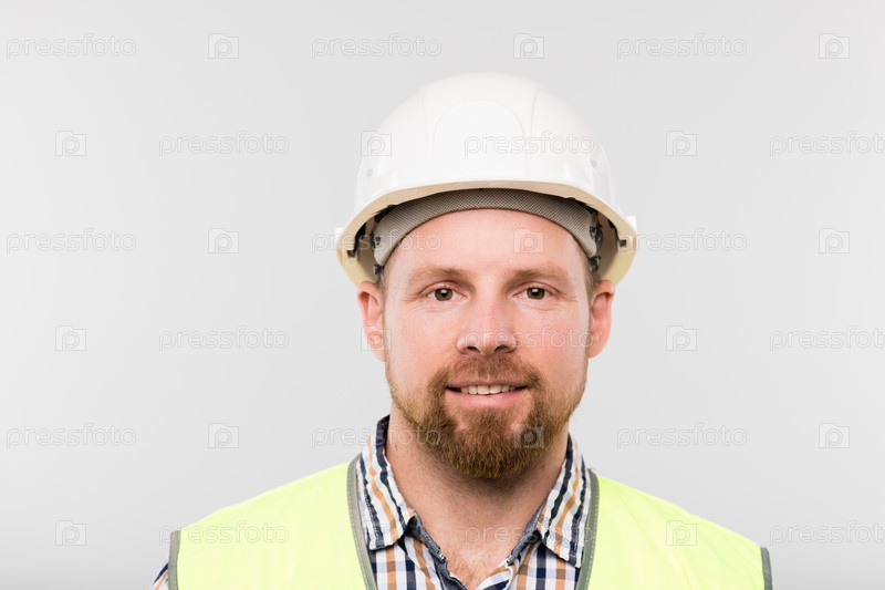Портрет молодого успешного строителя в белой шляпе и рабочей одежде в изоляции