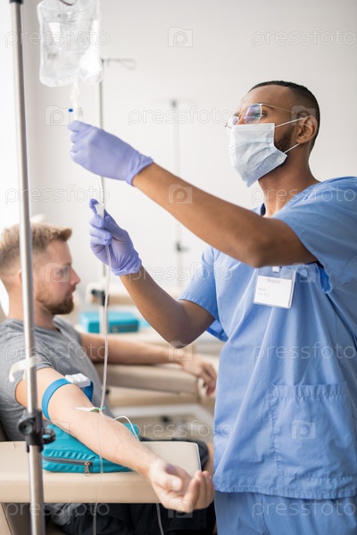Молодой врач смешанной расы в форме готовит капельницу для пациента в больнице