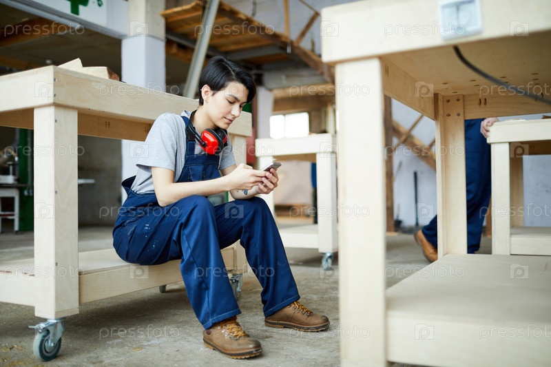 Леди-работница отправляет смс-сообщения во время перерыва