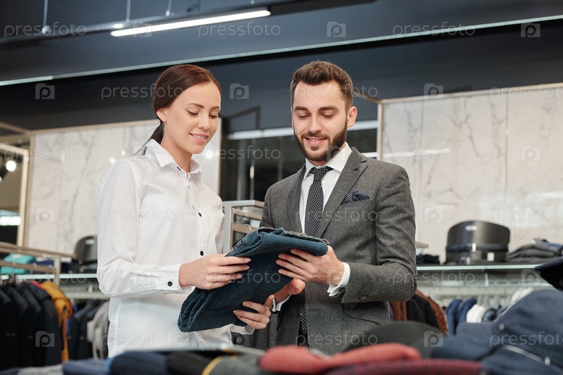 Молодой человек в костюме выбирает новые джинсы и дружелюбный продавец помогает ему