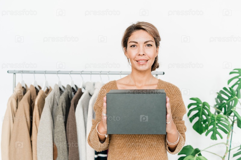 Счастливая молодая стильная женщина в непринужденном пуловере, держащая черную коробку у груди