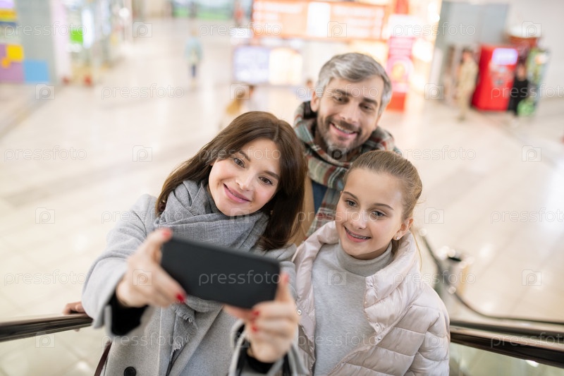 Счастливая мать, дочь и отец делают селфи на эскалаторе в торговом центре
