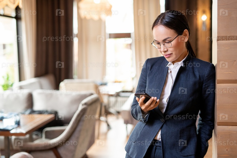 Серьезная молодая бизнес-леди в формальной одежде просматривает сообщения